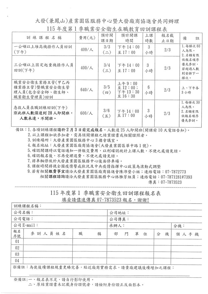 > 【115年度第1季回訓課程資訊】 本會暨大發產業園區服務中心訂於115年3月份共同辦理「115年度第1季職業安全衛生在職教育回訓課程」(如附件),敬請貴公司(廠)轉知員工踴躍報名參加,請查照。